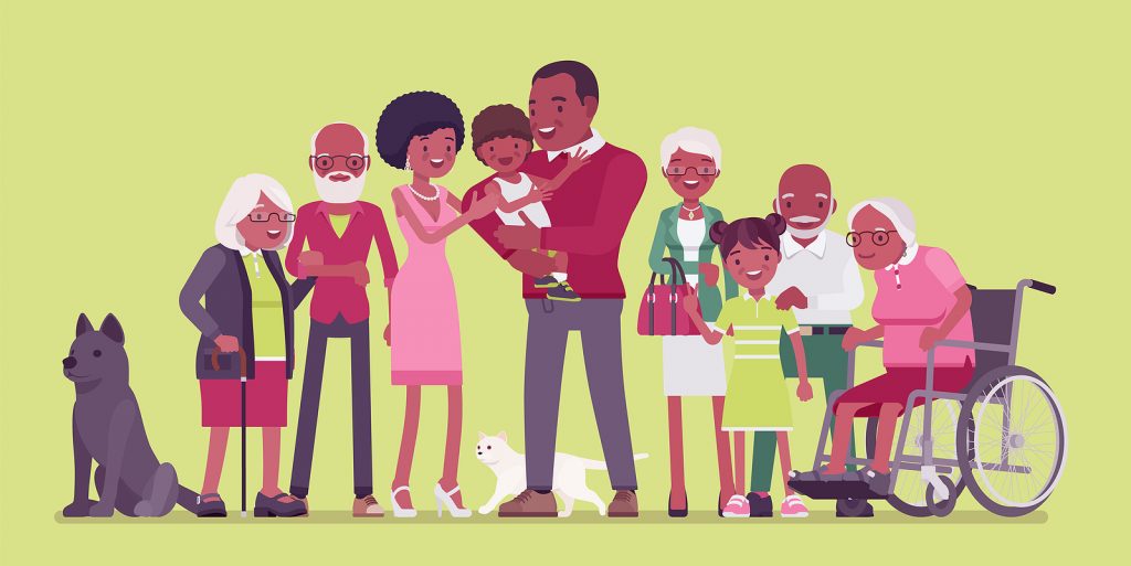 Multigenerational black family, common household, people living together in support. Four generation portrait, parents, grandparents, great-grandparent, children together, pets. Vector illustration
